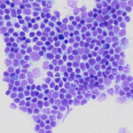 At this time, a biochemical panel revealed marginal hypoalbuminemia (3.1 g/dL, reference interval, 3.2-4.1 g/dL). Mild generalized peripheral lymphadenopathy was detected on physical examination and the left prescapular (measuring 1.6 x 2.6 x 3.0 cm) and popliteal (measuring 1.6 x 2.0 x 1.7 cm) lymph nodes were aspirated. Direct smears prepared from the aspirates were submitted for cytologic analysis.