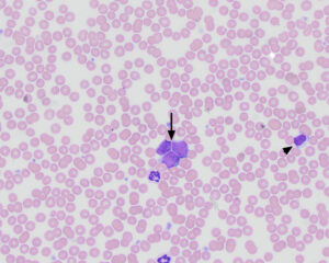 There are three intermediate to large cells (“other WBC”) with small amounts of light to medium blue cytoplasm, fine nuclear chromatin and 1-2 indistinct nucleoli (arrow). Compare the size and nuclear chromatin of these three cells with the small lymphocyte (arrowhead), which has slightly more clumped chromatin and no nucleoli. Given that the cells were identified in the first hemogram from the dog three months prior and there was a lack of cytopenias, the cells were interpreted as being neoplastic lymphocytes (Modified Wright stain, 50x objective)