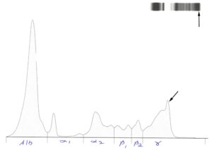 The electrophoretogram shows a small sharp monoclonal peak on a polyclonal base in the gamma region (arrow). The monoclonal peak is just discernible as a sharp band in the snapshot of the bands above the densitometric tracing (arrow). The electrophoresis was done using a capillary zone technique, 5 months after surgical removal of the tumor. The cat was on prednisolone therapy at the time, which may explain the small peak on the electrophoretogram and potentially the normal globulin concentration on the chemistry panel.