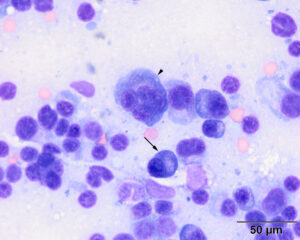 Note the cells with a distinct perinuclear zone and plasma cell appearance (arrow) and multinucleated tumor cells with round nuclei (arrowhead). The tumor cells displayed moderate anisokaryosis and anisocytosis, although many are ruptured in this image (modified Wright’s stain, 100x objective)