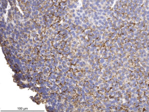 Most of the tumor cells showed strong membrane staining for CD20 (brown stain). This B cell marker can be positive in plasma cell tumors, whereas an immunostain for MUM-1 (typically used as a plasma cell marker) was negative, but we have found this immunostain can be unreliable in cats.