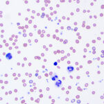 The cat was transferred to the Small Animal Medicine Service the next day. A mass effect was palpated in the cranial abdomen. Abdominal ultrosonographic assessment revealed a mass at the pyloric-duodenal junction. A fine-need aspirate was taken of the intestinal mass under ultrasonographic guidance and submitted for cytologic assessment (Figures 3-5). View the images from blood and the intestinal mass and then answer the questions below.