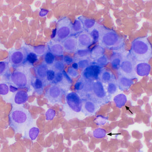 This grouping of neoplastic cells appears more cohesive and the cells have distinct cell boundaries. A few bare nuclei are seen around the edges (arrows) (modified Wright stain, 50x objective).